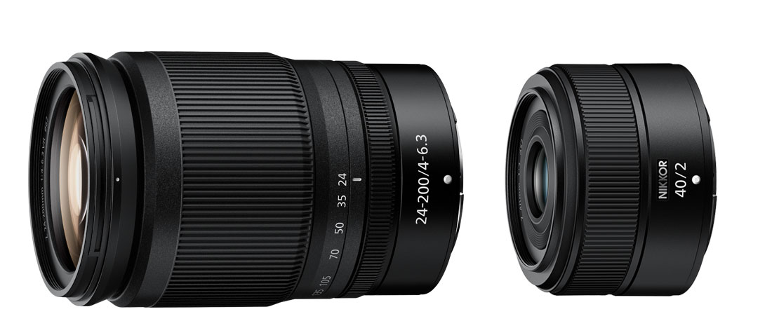 (l. to r.) The NIKKOR Z 24-200mm f/4-6.3 VR zoom lens and the NIKKOR Z 40mm f/2 prime lens. Both are Nikon mirrorless lenses for the Nikon Z series mirrorless camera system.