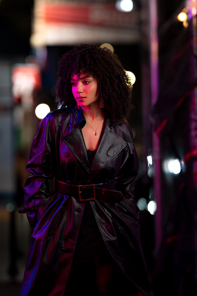 Gotham Pink. “While we were walking around Soho, I noticed a restaurant with a neon pink sign casting pink light. I thought this could be a great way to add some fun and pop of color in the image while adding to the story of Jada’s night out in NYC. So, I placed Jada under the light but it washed over her entire face, but I loved the pink lighting on her leather jacket, so I decided to place the strobe on the right side of her face so that the pink neon acted more like a side light while leaving her natural skin tone,” notes Aaron.