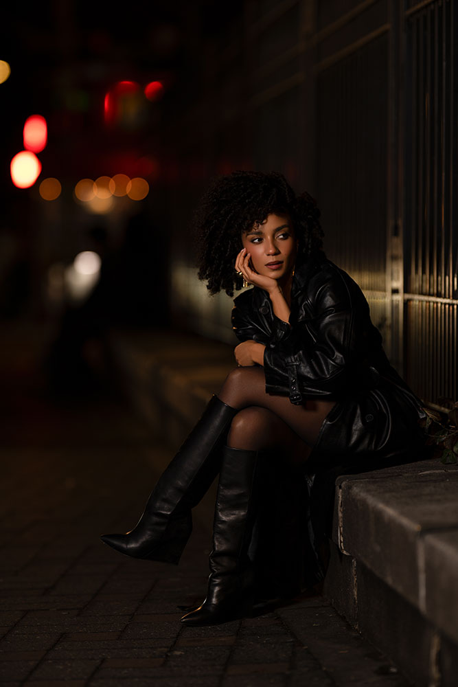 This was my first night shoot and I wanted to challenge myself to photograph a dark-haired subject with the quintessential New York all black outfit.