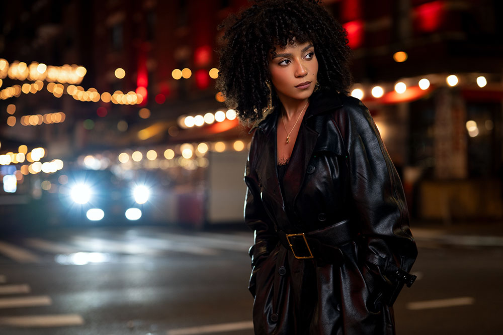 A Night Out In Little Italy. There were lots of lights on the street and building. “I wanted it to feel like she was on the go. I waited for a car to appear on the left side of Jada to add more depth to the image while also feathering the strobe to add some light to Jada’s face,” notes Aaron.