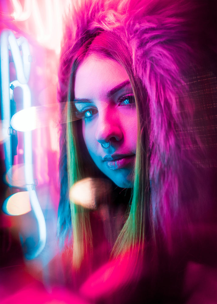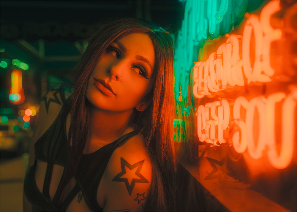 “I try to utilize the light, color and composition to put my model in a surreal neon world with minimal need for post-processing. There’s always a balance of using the light to emphasize characteristics of the model and not have it overshadow them.”