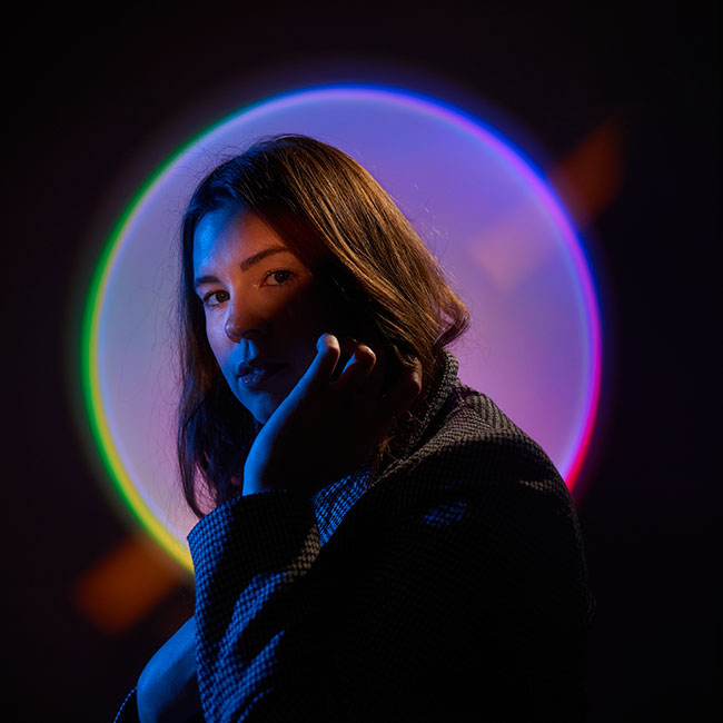 This is my wife, taken in our house. I wanted to create a really colorful image with bold contrast, and I knew I wanted to shoot in the square format. I used an LED sunlamp behind her, cycling through different colors as we shot. Strobes provided the main illumination with a light modifier to create a strip of light across her eyes. Nikon Z f, NIKKOR Z 40mm f/2 lens, 1/200 second, f/2.8, ISO 640.
