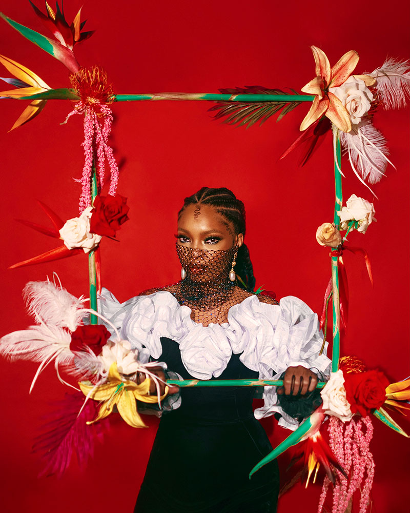 This image was the collective effort of a pretty large and talented team. The stylist came up with the outfit, she wanted a more “avant-garde” look. The set designer built the floral frame and my main contribution on set was the backdrop color and the picture—I just thought it looked cool.