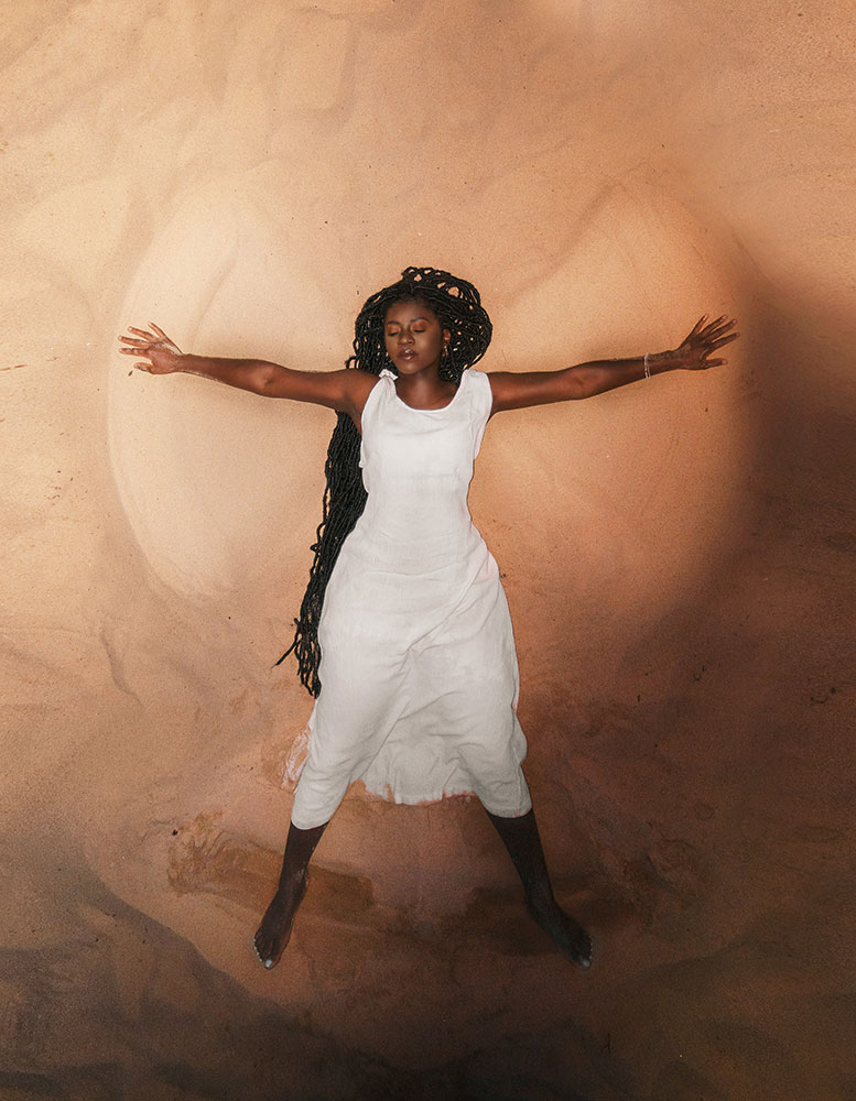 I’d been thinking of this idea for a while. I love doing shoots with interesting or unexpected elements, but it wasn’t strictly planned out. We just came up with an outfit, went to the beach and I started giving her this character to embody. I thought a sand angel would be a cool spin-off of a snow angel.