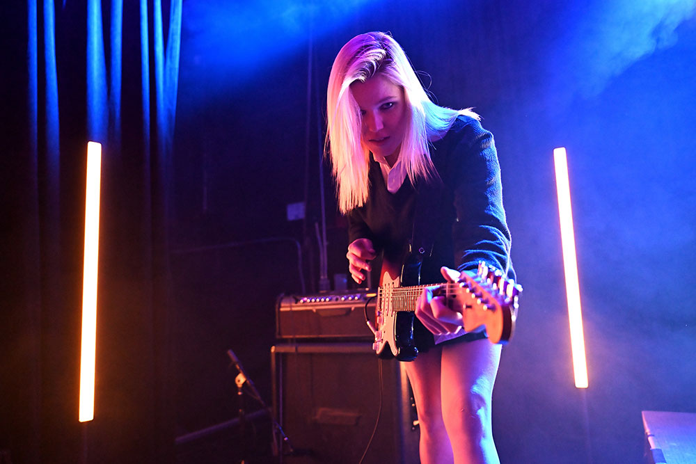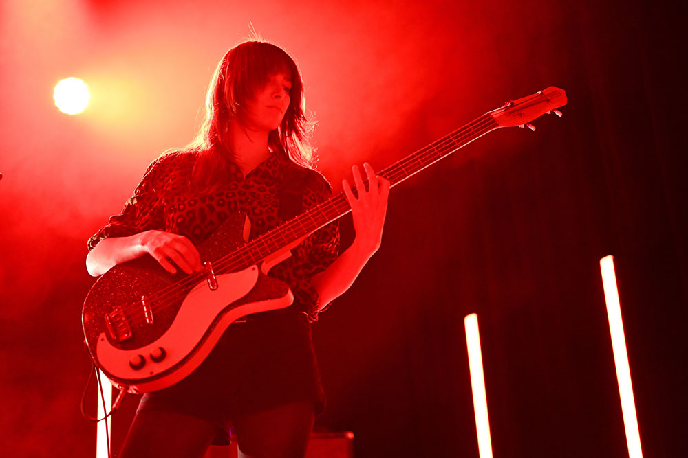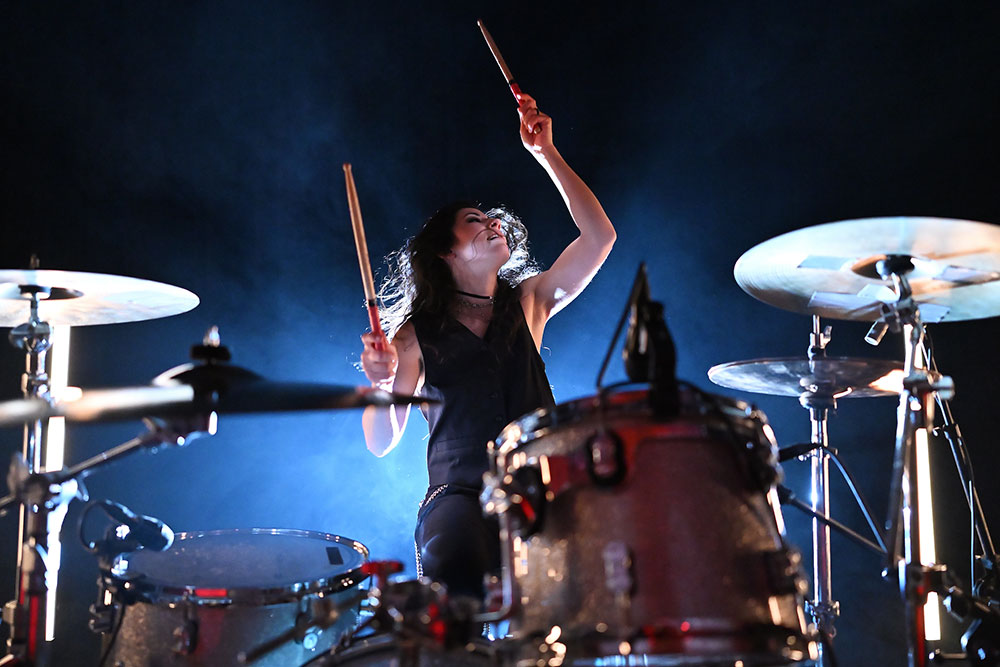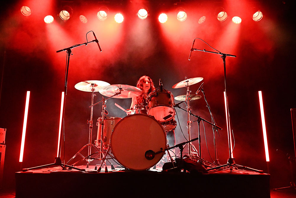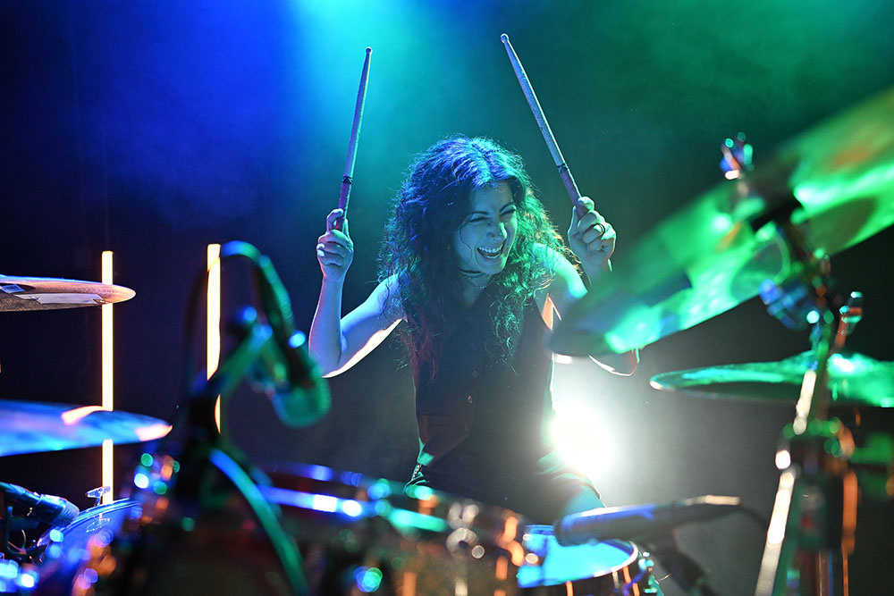 This photo of Jess is one of my favorite ways to photograph drummers—up close and shooting through the kit. It’s a great challenge, because there are so many ways to miss focus, from subject detection catching on a foreground element, to subject tracking not keeping up with the action and more. You can see from Jess’s flying hair that she’s in motion—she was headbanging in this moment, and the Nikon Z5II tracked her perfectly. For photos like this, I always lock focus on the face of the drummer and use Nikon’s 3D tracking mode to track the subject through their motions. Even as I recompose and respond to the subject’s action in the frame, focus is maintained. I love this combination of precision and freedom. The Z5II locked focus effortlessly through Jess’s constant motion, even at 24mm where the smaller proportion of the subject is challenging, especially with so many elements right around the face.