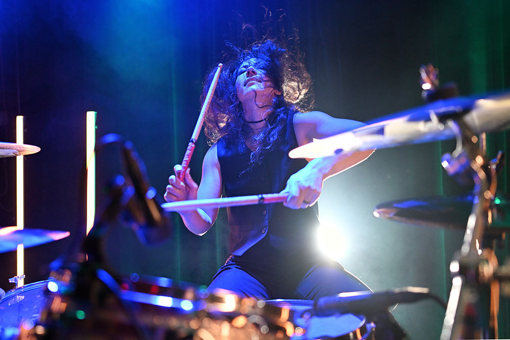 When photographing drummers, I’m always looking to ideally see two hands and two drumsticks. Mix in dramatic backlighting and swirling hair, and there’s a great challenge—and opportunity.