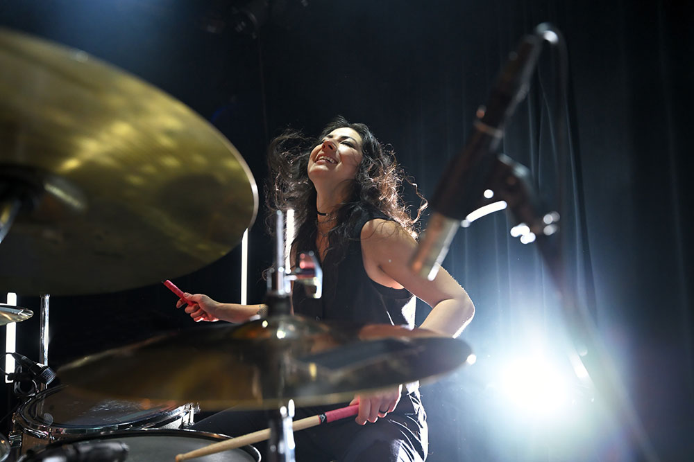 For example, if I’m photographing drummers and want to freeze the motion, like in this photo of Jess, I used a shutter speed of 1/1000 to freeze the action. You can see her hair frozen, swirling around her face and the drum sticks perfectly frozen.