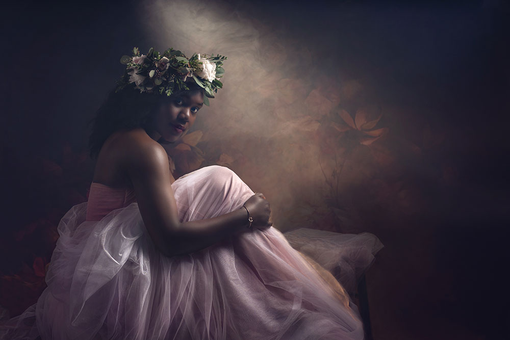 "Inspired by the Dutch Master painters from European art galleries, I love to use light, texture and color to create painterly portraits. For this portrait I used 3 lights, a painted canvas background, and layers of tulle that I picked up from the local fabric store. To get the dark painterly effect, I used Rembrandt light and underexposed by one stop to really embrace the shadows."