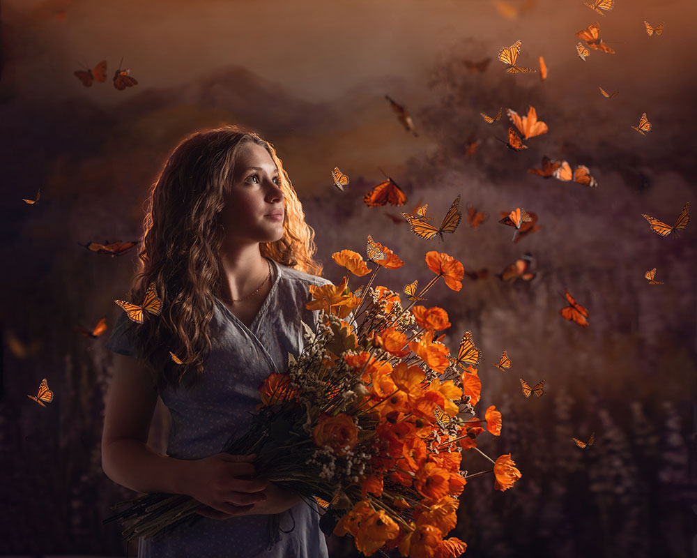 "On a recent trip to Paris, I woke in the middle of the night from a dream I had of a bouquet of flowers turning into butterflies. I’m always so inspired when I visit Paris. No place feeds my creative well more. I knew I wanted to create that portrait when I came home. I hung dozens of silk monarch butterflies with clear twine and got a bouquet of orange poppies to match. I used a few off-camera flashes to create directional light as well as backlight to illuminate my daughter."