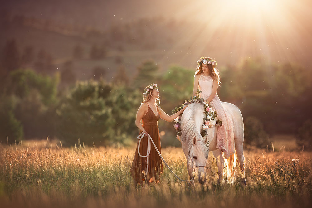 "I love to create magical images for my subjects. This was a mother-daughter photo session in my backyard with our horse. I made the flower crowns for my horse and subjects and waited until golden hour to shoot. The backlight was intense, so I added some fill flash in front to help lift the shadows on my subjects."