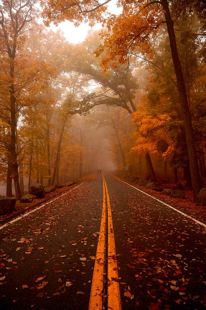 Bear Mountain is one of my favorite places to explore outside the city. This image was captured on one of those magical fall days where it was rainy and foggy. I was just taking some shots of the road when a few hikers appeared walking down the road. Their silhouettes barely showing through the fog to me is what takes the image to the next level, making it a lot more interesting.