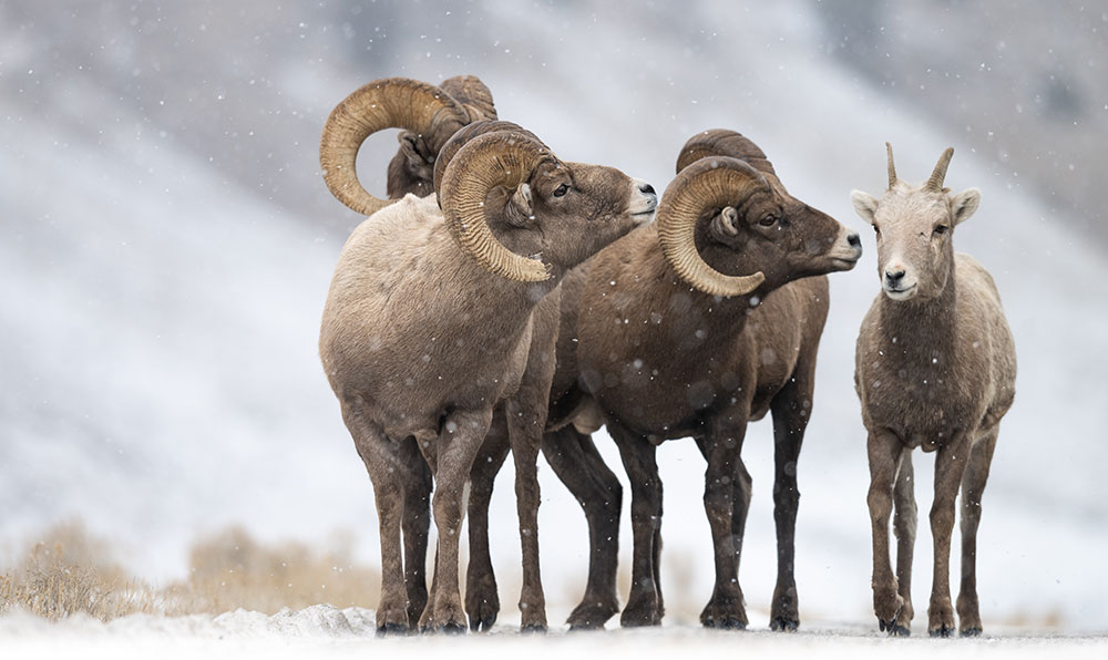 It Girl Three Rocky Mountain Bighorn Sheep rams swoon as an ewe in estrus passes by them. These iconic animals have one of the more aggressive ruts during the early winter, typically around the time of Thanksgiving. They are quite compelling to watch as the males kick each other in unsavory places, butt heads, and court their ewes while spreading their lips in a humorous flehmen response. On this day, I was laying in the road watching these boys in the snow. It was love at first sight when this pretty lady strutted by.
