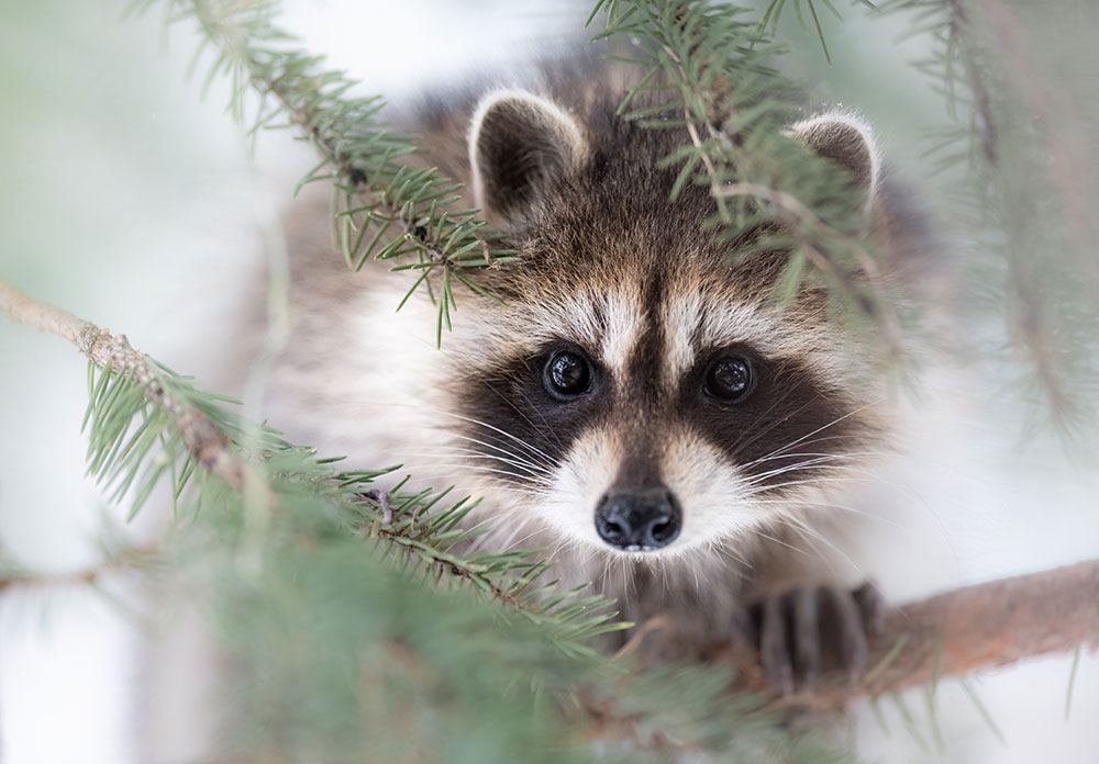 Peeping Tom On an overcast winter day I noticed I had company just outside my bedroom window. Two very young raccoons lay napping in a tight bundle up in an evergreen brushing up against the house. I left them for a few hours, then noticed they started to become active again as the afternoon grew dark. I eased my camera lens out the window and waited. They were a bit curious of me and dropped down to a lower limb where I captured this photo of one of the twins gazing into my window. These moments of intimate contact are my favorite as a wildlife photographer. As I looked into his world, he looked into mine. They continued down the tree after this brief encounter and plopped into the snow before shuffling off together into the wilderness.