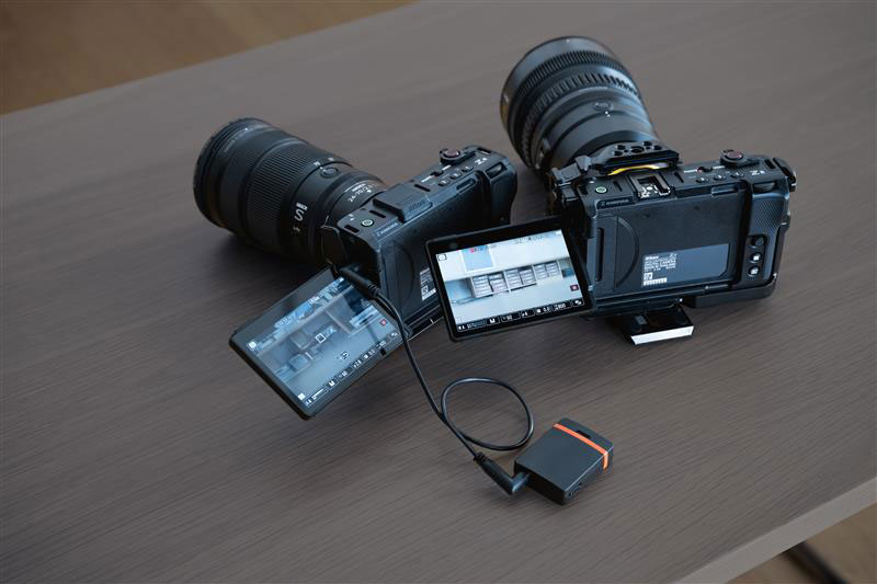 Nikon ZR cinema cameras shown with a Tentacle Sync unit attached to be able to sync timecode across multiple cameras.